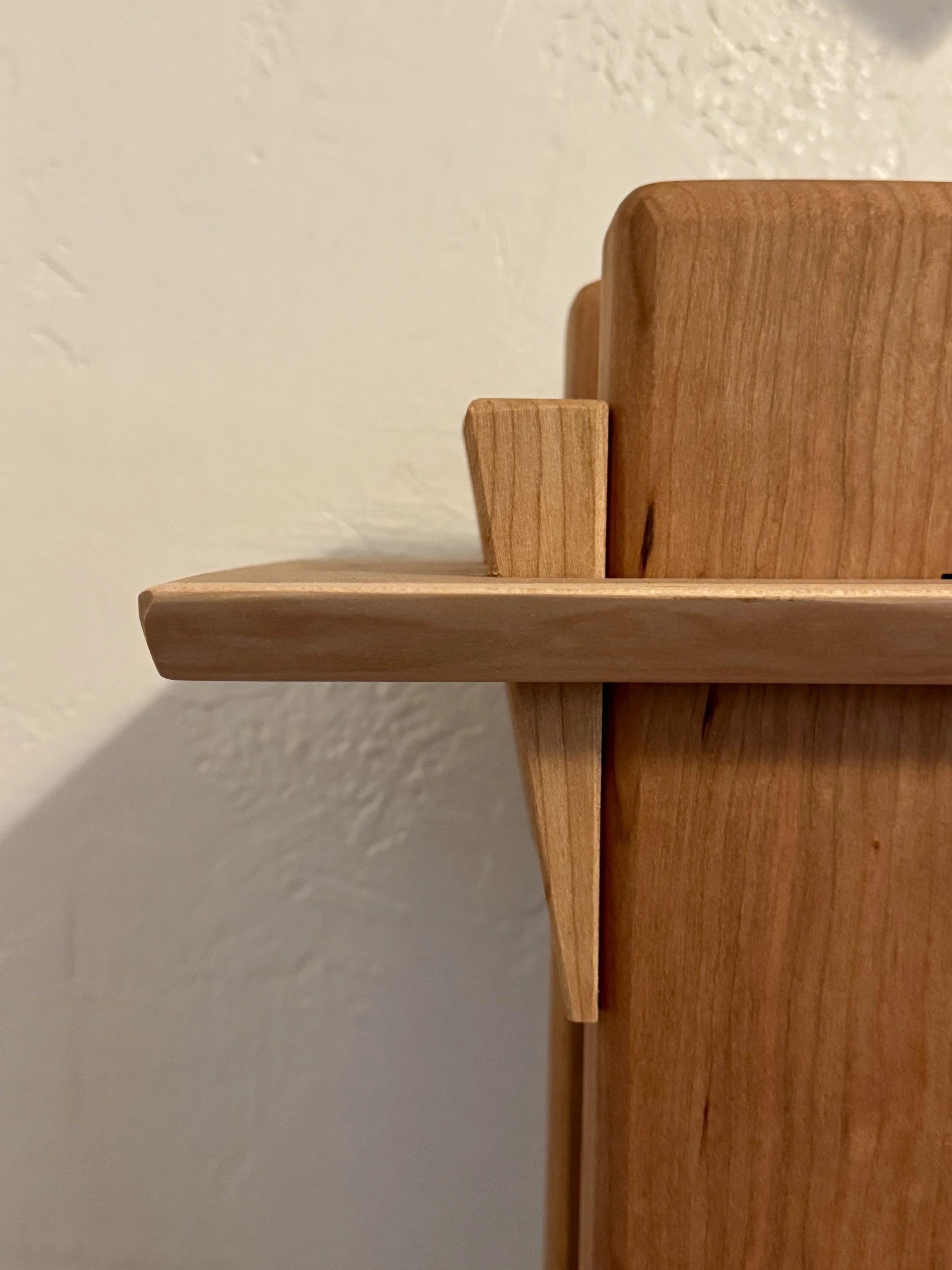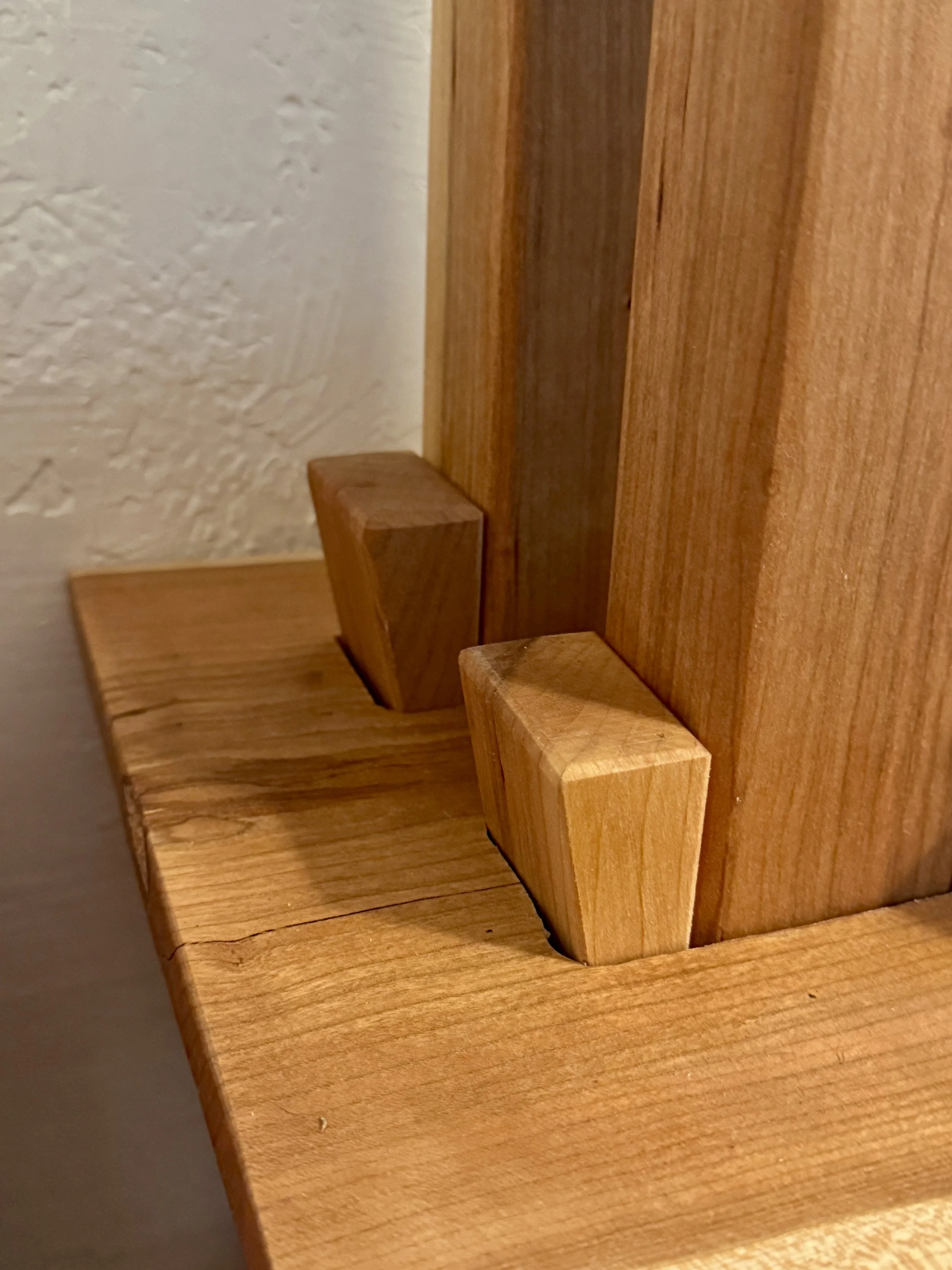 The design of this live edge display shelf was inspired by travels in Japan. Rectangular wedges hold the piece together, so there is no glue, screws, or nails. It can be easily disassembled and reassembled by simply removing or inserting the wedge shaped pegs. (12”W x 47”L x 37”H).